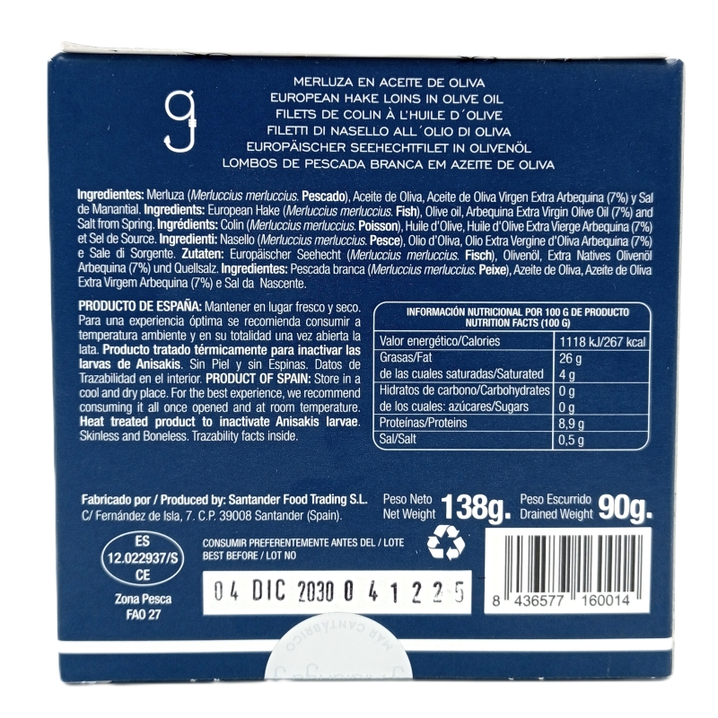 Merluza (Merluccius merluccius), aceite de oliva virgen extra arbequina, sal de manantial. (PESCADO).