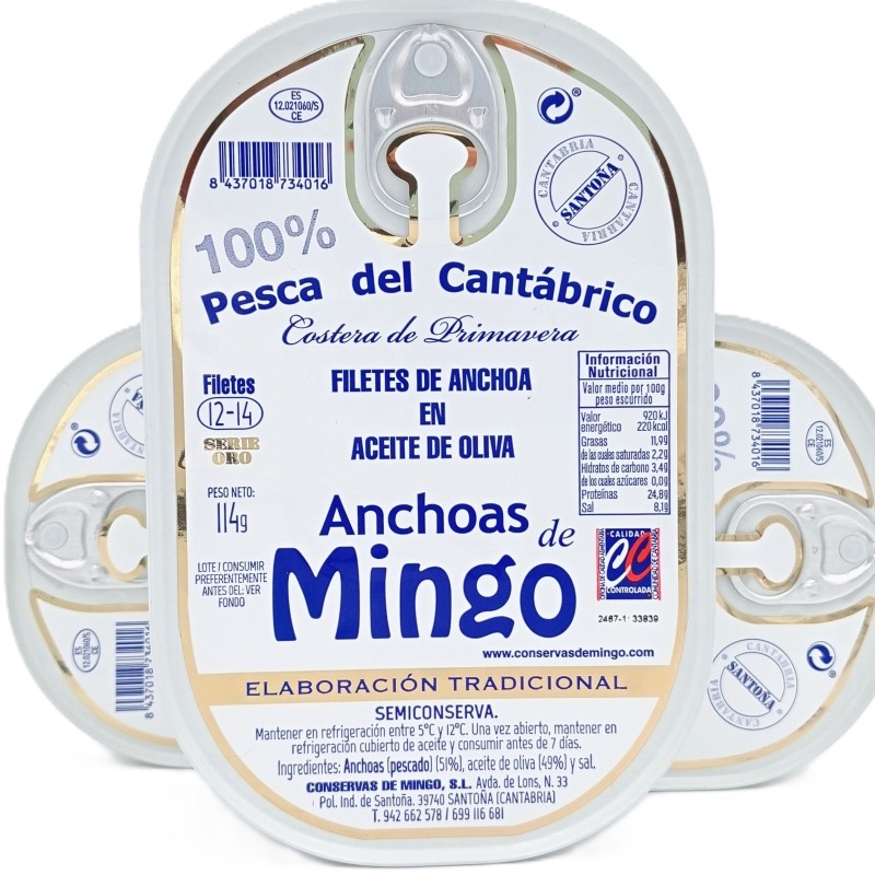 Auténticas anchoas del Cantábrico. Una lata de anchoas Mingo de alta restauración con 14 filetes. Ideal para 3-4 personas. Un complemento ideal para cualquier ocasión.